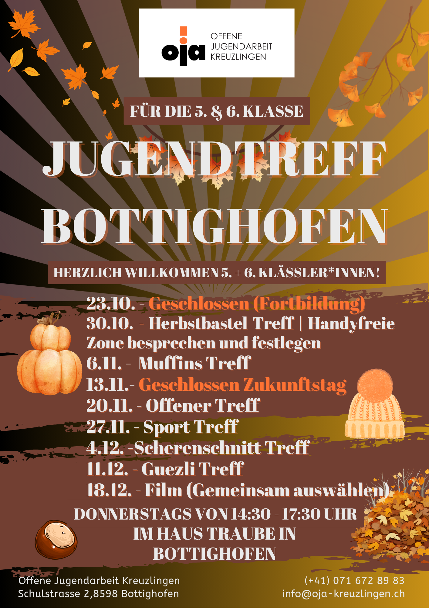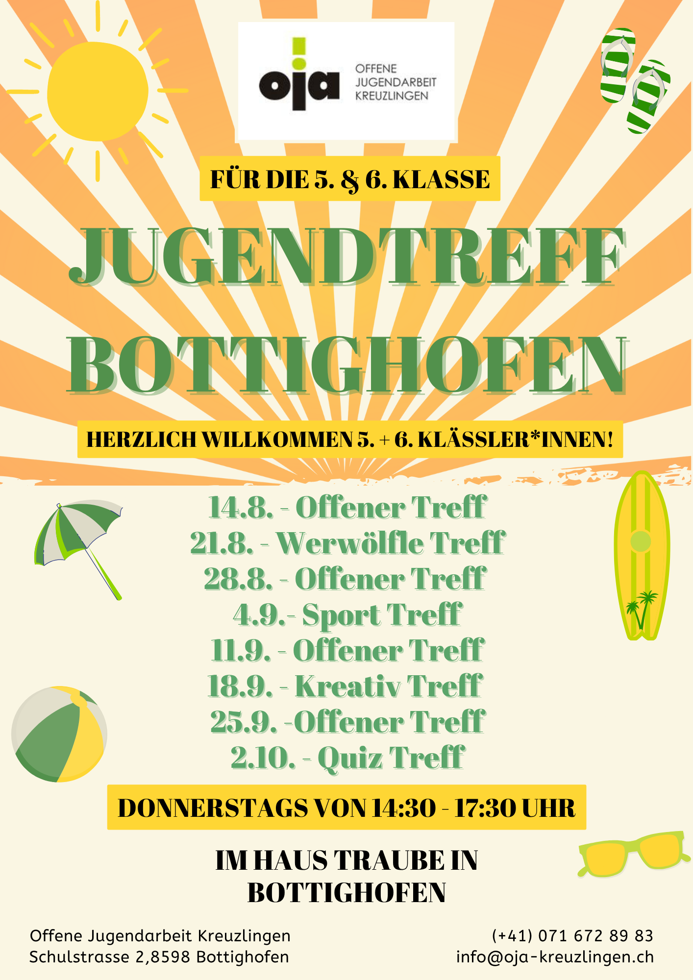 Am 02. März 2017 haben wir im Untergeschoss des Haus Traumes in Bottighofen einen neuen Jugendtreff eröffnet. Der Treff hat jeden Donnerstag von 14:30 – 17:30 Uhr für die 5. und 6. Klässler*innen der Primarschule Bottighofen geöffnet.Wir bieten ein vielfältiges und pädagogisch fundiertes Programm an, das wir stets über Flyer, im Schaukasten und auf unserer Homepage bewerben. Unser Fokus liegt darauf, Jugendlichen einen geschützten Raum für die Entwicklung sozialer Kompetenzen, die Entfaltung kreativer Potentiale und die Förderung von Partizipation und Selbstwirksamkeit zu bieten.